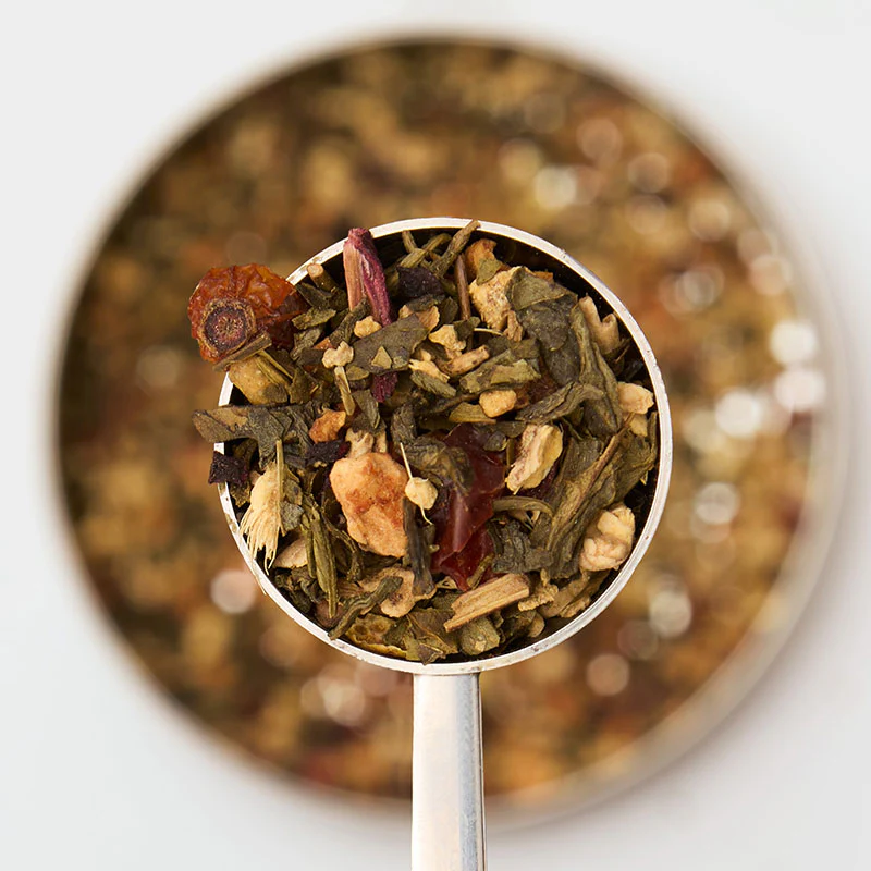 A snap of ginger and juicy peach in this Chinese green tea blend. Juicy juicy peach flavours balanced with just enough ginger to add a drop of fire to your cup– a magical twist on a classic blend.